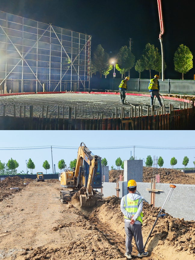 圖為明光科順涂料智能化生產(chǎn)基地項目筏板基礎混凝土澆筑、管道溝槽開(kāi)挖